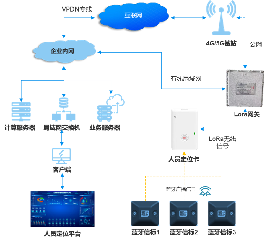 硬件包含低功耗藍(lán)牙信標(biāo)、LoRa定位基站以及人員和車輛佩戴或搭載的定位終端。