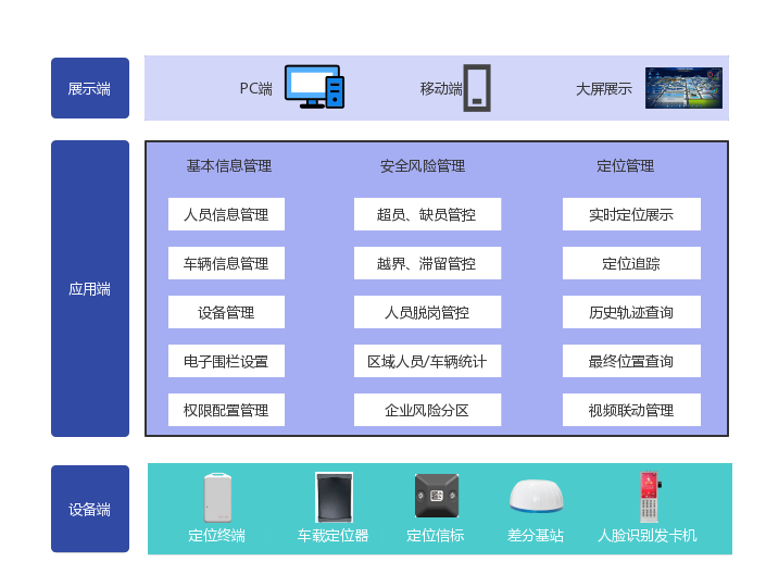 應(yīng)用端:根據(jù)管理需求,實(shí)現(xiàn)定位管理、安全風(fēng)險(xiǎn)管理、基礎(chǔ)信息管理等功能應(yīng)用;并可通過(guò)接口二次開(kāi)發(fā),基于人員定位進(jìn)行新的功能應(yīng)用。